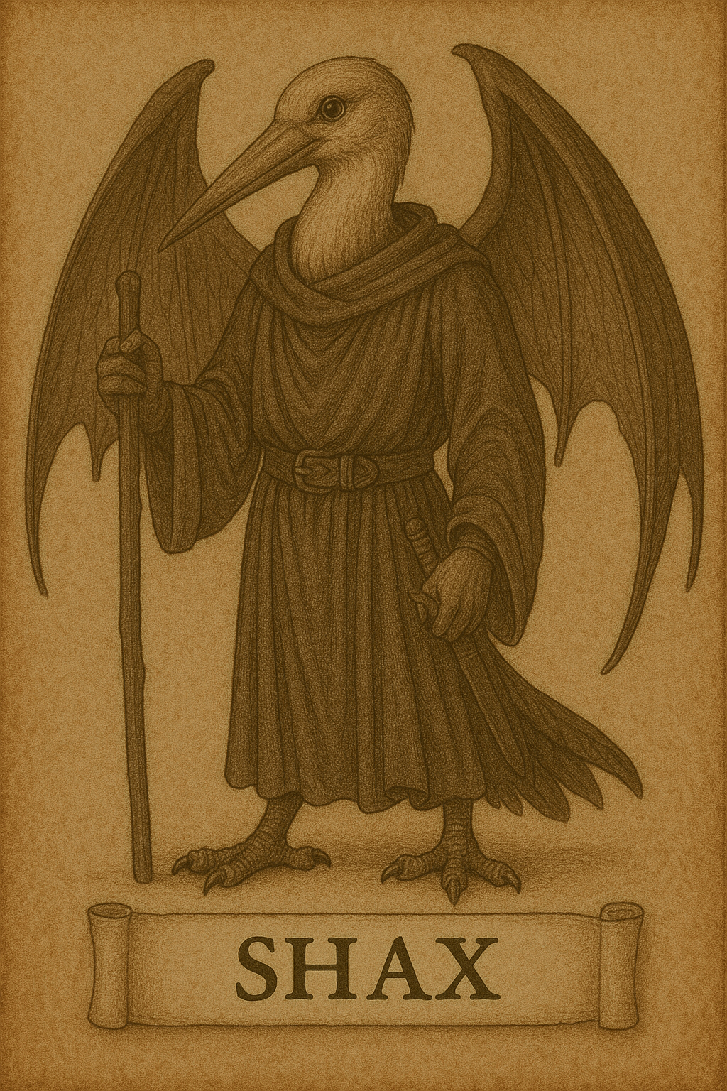 샥스는 도둑질, 정보 은폐, 청력 상실, 혼란, 혼동의 암흑을 관장하는 악마입니다.