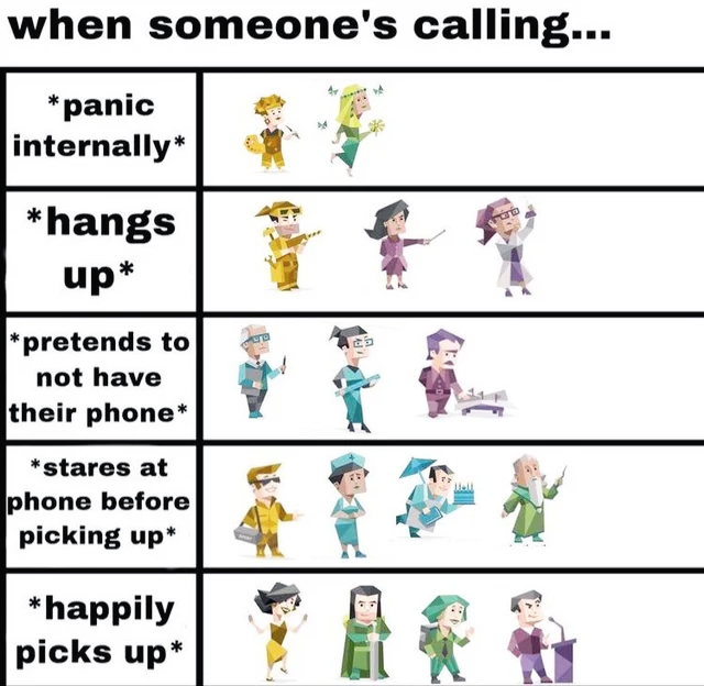 estp, isfj, esfj, infj : *전화를 받지만, 전화를 받기 전에 몇 초간 전화기를 빤히 쳐다본다*