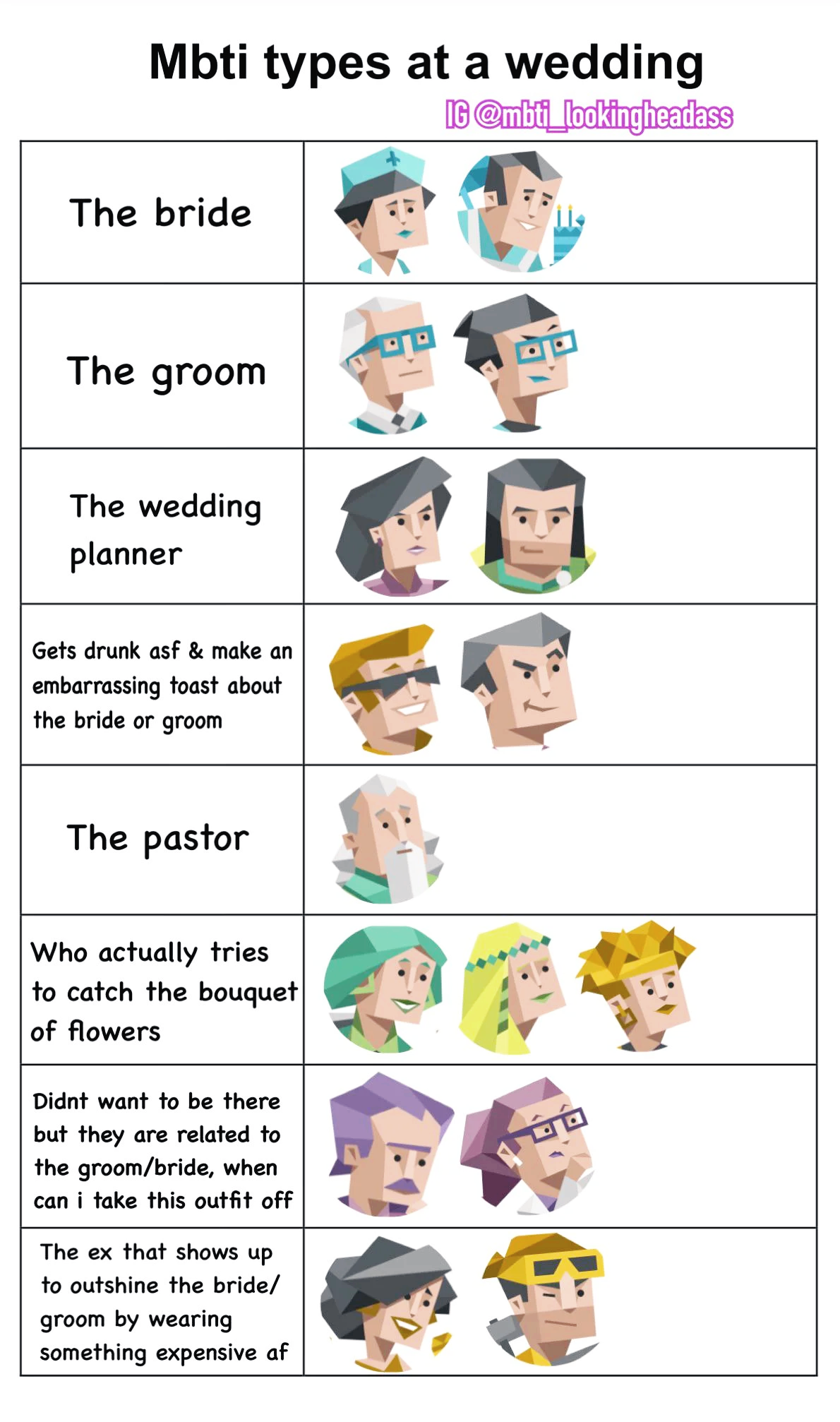 esfp, istp : 신랑or신부의 전연인으로 신랑or신부보다 눈에 띄고, 매우 비싸보이는 옷을 입고 참석함.