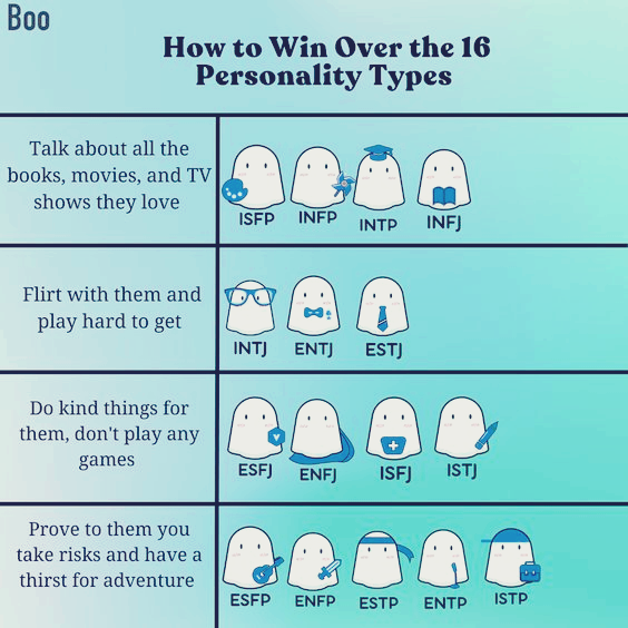esfp, enfp, estp, entp, istp : 그 유형에게 당신이 위험을 감수하는 걸 즐기고 모험을 좋아하는 성격이라는 것을 은근슬쩍 어필해준다.