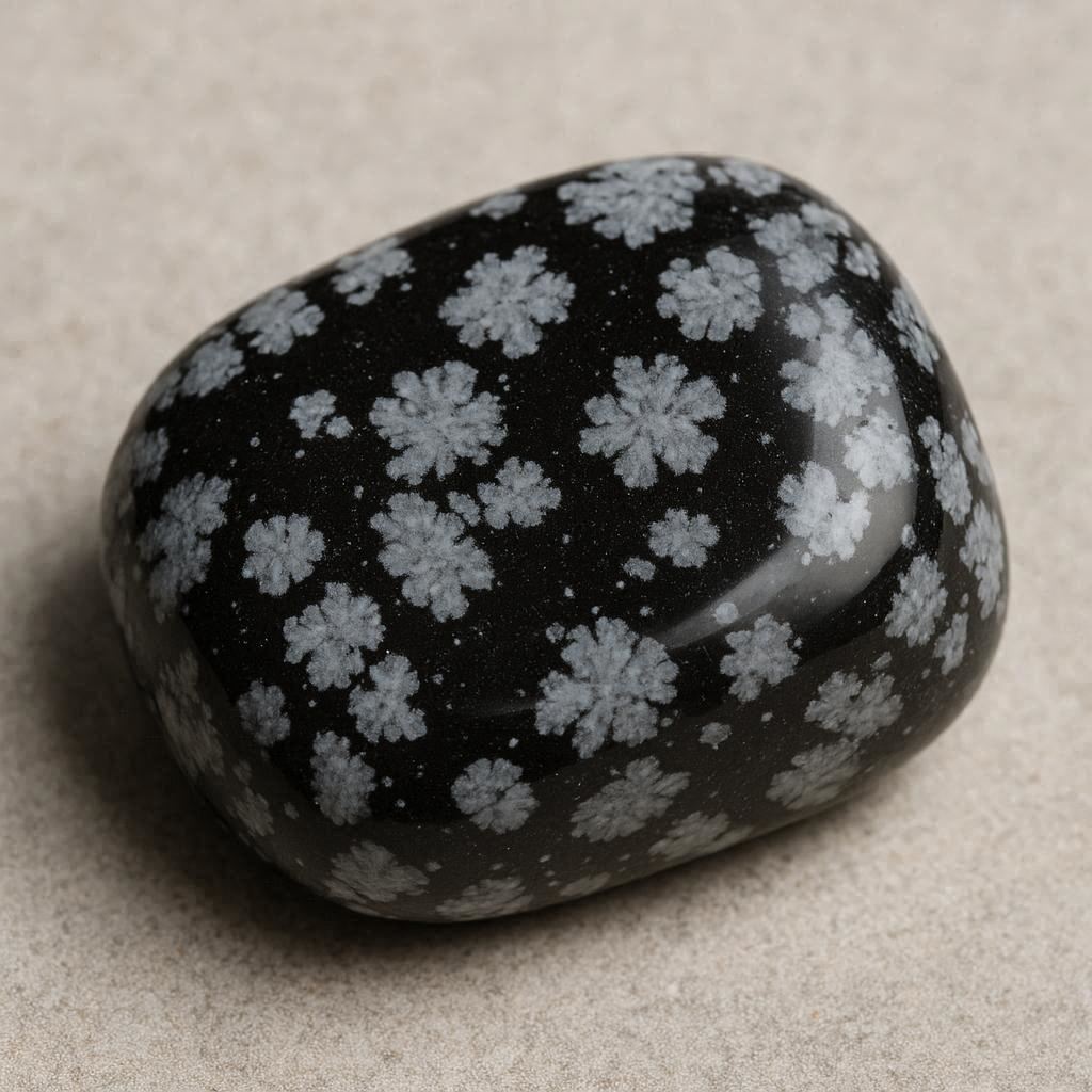 스노우플레이크 옵시디언은 검은 바탕에 눈송이처럼 흩어진 무늬가 박힌 독특한 화산석입니다.